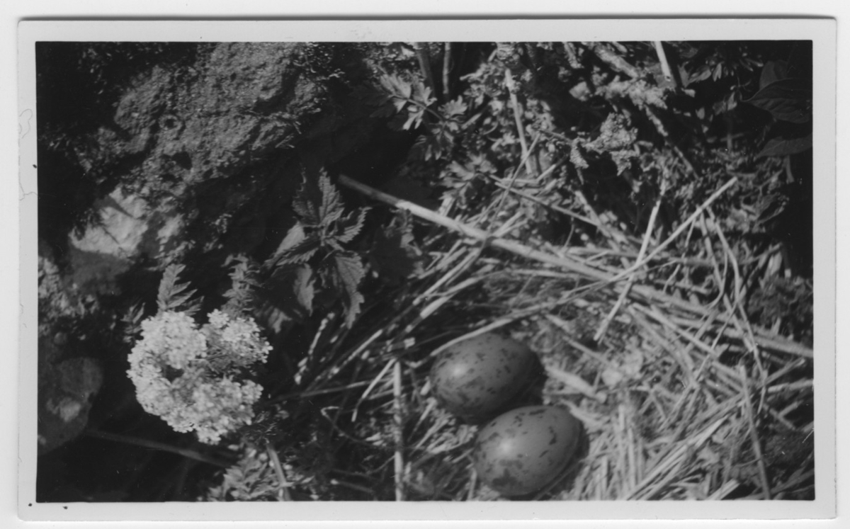 'Bo med 2 st ägg av fiskmås. :: :: Text på baksidan av fotot: ''Fiskmåsens bo med 2 st ägg dekorerade med vackra blommor i en bergskreva på en udde. Fotot taget med 40 cm lins.'' :: :: Ingår i serie med fotonr. 4500:1-172.'