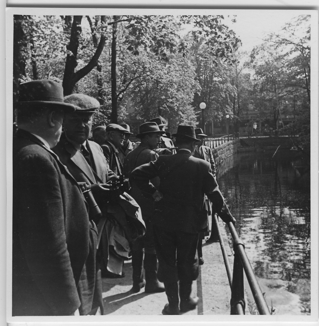 'Biologiska Föreningens utfärd till Oset och Kvismaren. :: :: Gruppen, ca 10 personer, män, ståendes invid räcket mot Svartån i Slottsparken i Örebro, I bakgrunden skymtar affärer på Engelbrektsgatan. Leonard Axel Jägerskiöld stående snett till höger bakom mannen med kikare i händerna. Kläder. Klädsel. :: :: Ingår i serie med fotonr. 4386:1-18.'