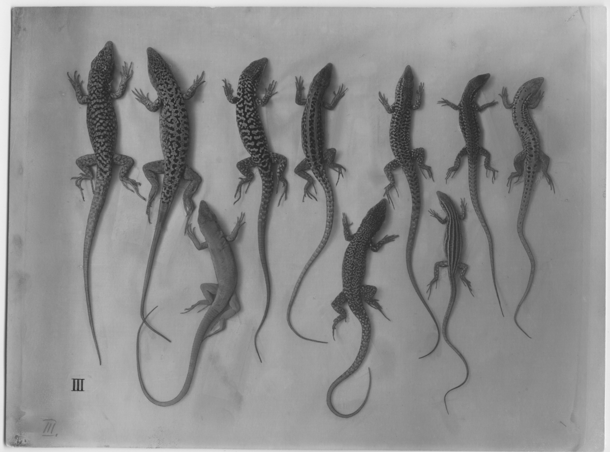 '10 ödlor lagda invid varandra. :: :: Ur ing.Otto Cyréns ''Klima und Eidechsenverbreitung''. Meddelande från Göteborgs Museum, Zoologiska avdelningen 29. :: :: Ingår i serie med fotonr. 4503-4504.'
