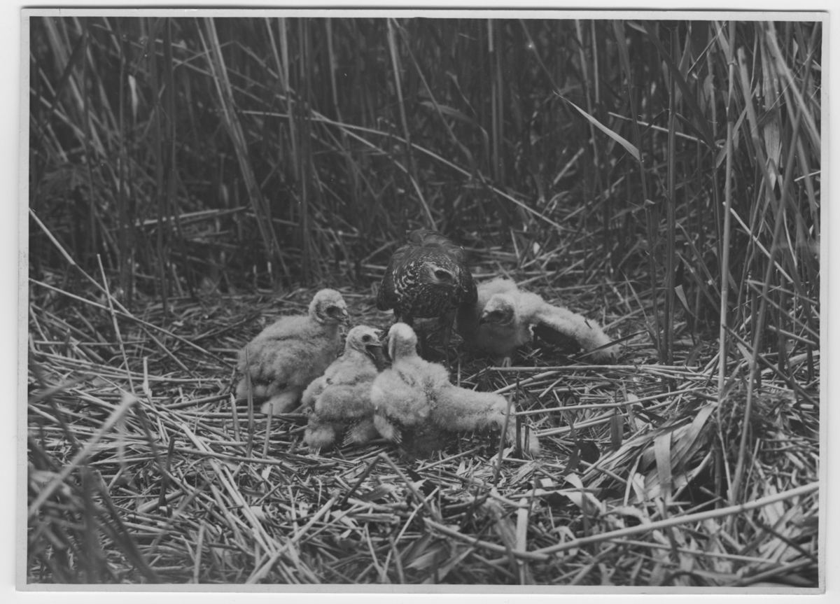 'Blå kärrhök, hona på boet med 4 st små ungar i vass. :: :: Ingår i seie med fotonr. 4167-4175.'