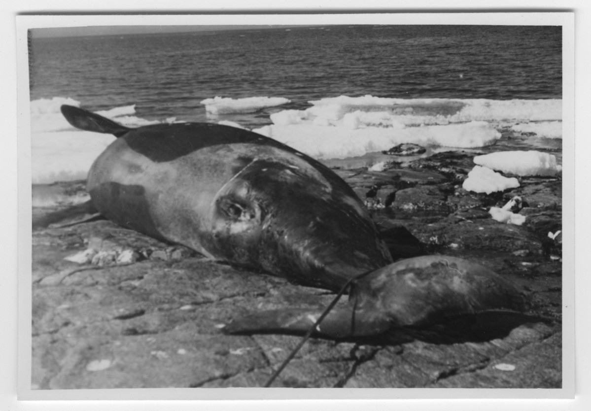 'Späckhuggare, strandad på Brattön: :: :: Späckhuggare liggande på sidan på klippstrandkanten. Sedd bakifrån med stjärtpartiet i förgrunden. Vy ut mot havet, isflak vid strandkanten. :: :: Ingår i serie med fotonr. 4212:1-6.'