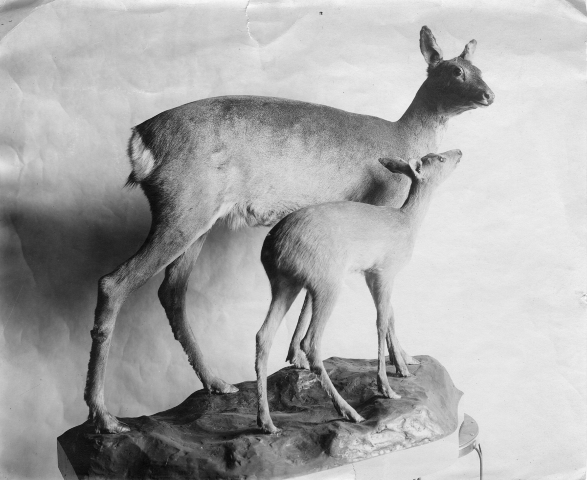 'Monterad hind och killing. :: Hona: Ma.su. 266. Fynddatum: 1901-12-18. :: Killing: Ma.su. 276. Fynddatum: 1903-00-00. Finns utställd i monterskåp nr. 63 i däggdjurssalen på Göteborgs Naturhistoriska Museum (2008-02-04). :: :: Fotonr 4378:1-2.'