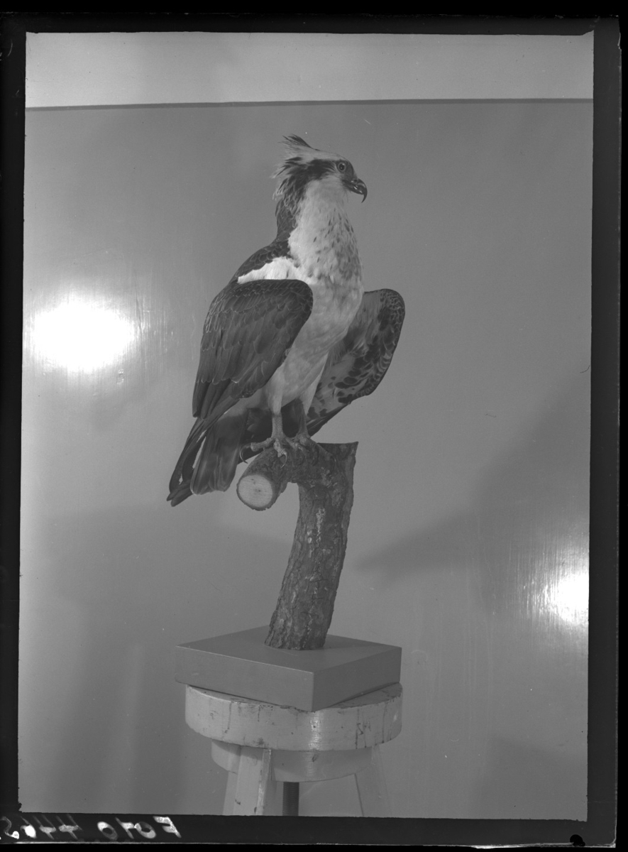 'Fiskgjuse, hane. Fynddatum: 1926-04-23. :: :: Montaget finns utställt i monterskåp nr. 230 i fågelgången på Göteborgs Naturhistoriska Museum (2008-02-11).'