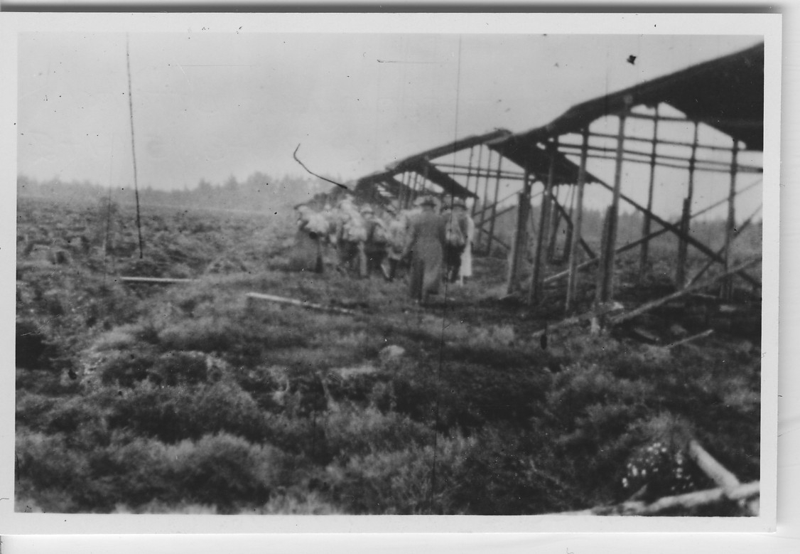 'Biologiska föreningens utfärd till Kävsjö mosse: :: :: Gruppen män från föreningen går över mossen, förbi träskjul. Något otydlig bild. Torvbrytning. :: :: Ingår i serie med fotonr. 4227:1-9.'