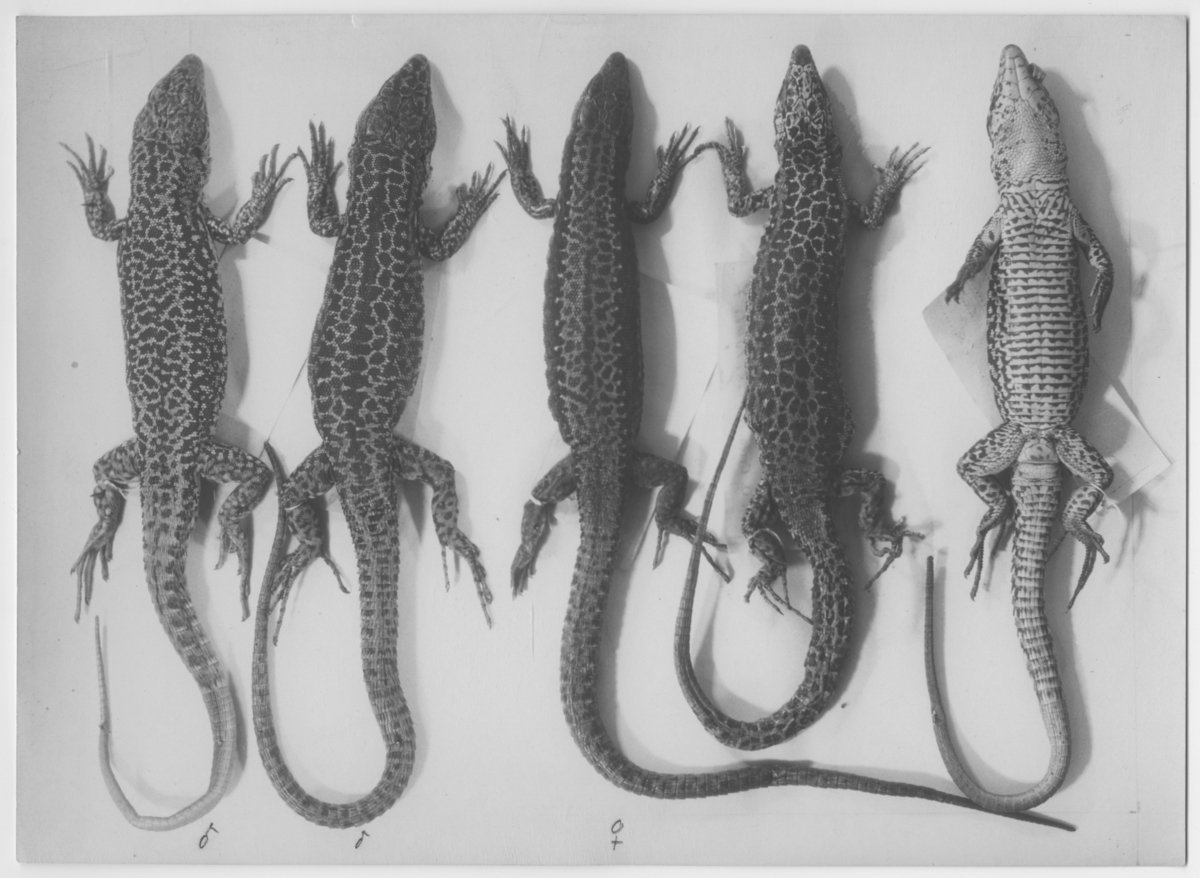 '5 st ödlor, fyra sedda från ryggsidan och en från buksidan. Från vänster: hane, hane och hona. :: :: Fotonr 4505:1-9: Fotografier över diverse ödlor ur Ingenjör Otto Cyréns ''Spanische und portugiesische Mauereidechsen''. Meddelande från Göteborgs Museum Zoo.46 + 2 teckningar.'