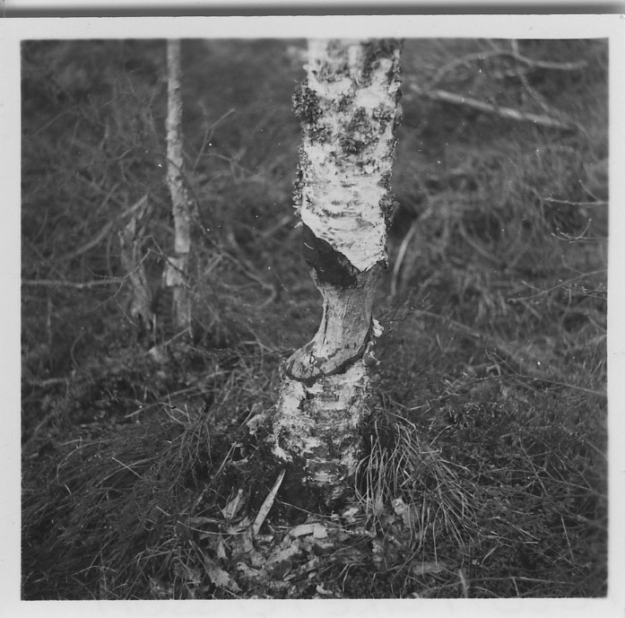 'Biologiska föreningens utfärd till Sveafallen och Villingsbergs kronopark. :: :: Närbild på stående björkträdstam på vilken en bäver har gnagt. :: :: Se fotonr. 4226:1-34, 4228:1-3 och 4229:1-3 från samma utfärd.'