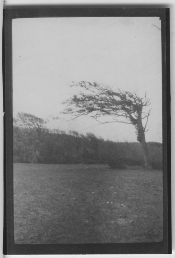 'Biologiska föreningens utfärd till Hallands Väderö: :: :: Vindpinade träd: :: :: ''Vind-lind med löv på stammens läsida.'' Vy med öppen mark med den vindpinade linden. :: :: Se fotonr. 1464 och 4311:1-58 från samma utfärd.'