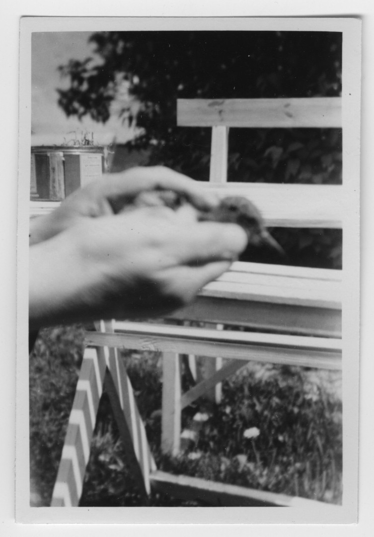 'Erik Börjesson håller 1 st unge av strandskata i handen, bara händerna synliga. I bakgrunden syns träbänk. :: Text enligt foto: ''Jag håller i mina händer 1 st veckogammal unge av strandskatan, som källarmästaren Arvid Carlssons, Hotell Öland, yngste son funnit på stranden norr om Färjestaden en halv timme innan jag reste med båten till Kalmar. Pojken tog fotografiet i trädgården. Fotot är taget på 40 cm avstånd.'' :: :: Ingår i serie med fotonr. 4500:1-172.'