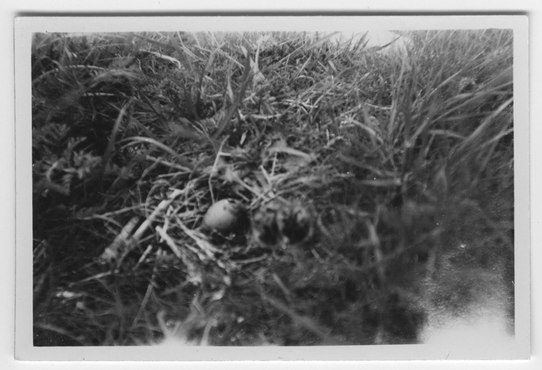 'Text enligt foto: ''Ett skrattmåsbo med 1 st nykläckt unge och 1 st kläckfärdigt ägg, där ungens näbb syns upptill på ägget på en tuva i Lenstadsmossen i Svarttärnekolonien. Fotot taget på 55 cm avstånd.'' :: :: Ingår i serie med fotonr. 4500:1-172.'