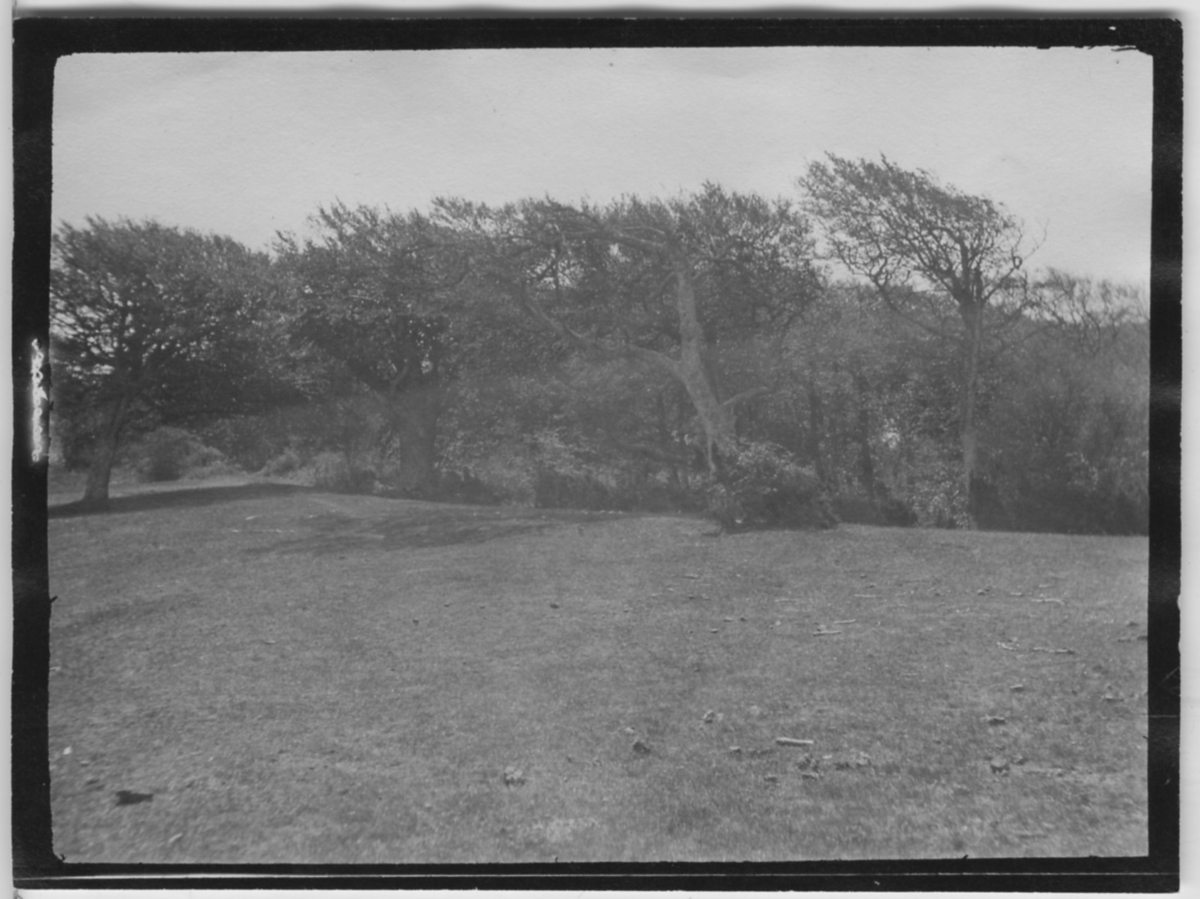 'Biologiska föreningens utfärd till Hallands Väderö: :: :: Vindpinade träd: :: Vy med öppen gräsmark och en rad med vindpinade glest stående träd. Med buskvegetation i bakgrunden. :: :: Se fotonr. 1464 och 4311:1-58 från samma utfärd.'