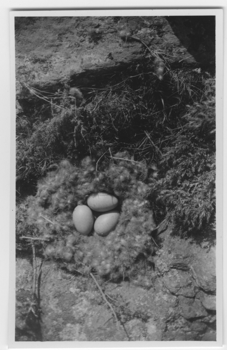 'Bo med 3 ägg på Kalvön, dunkrans kring boet på berghäll. :: :: Ingår i serie med fotonr. 4401-4440.'