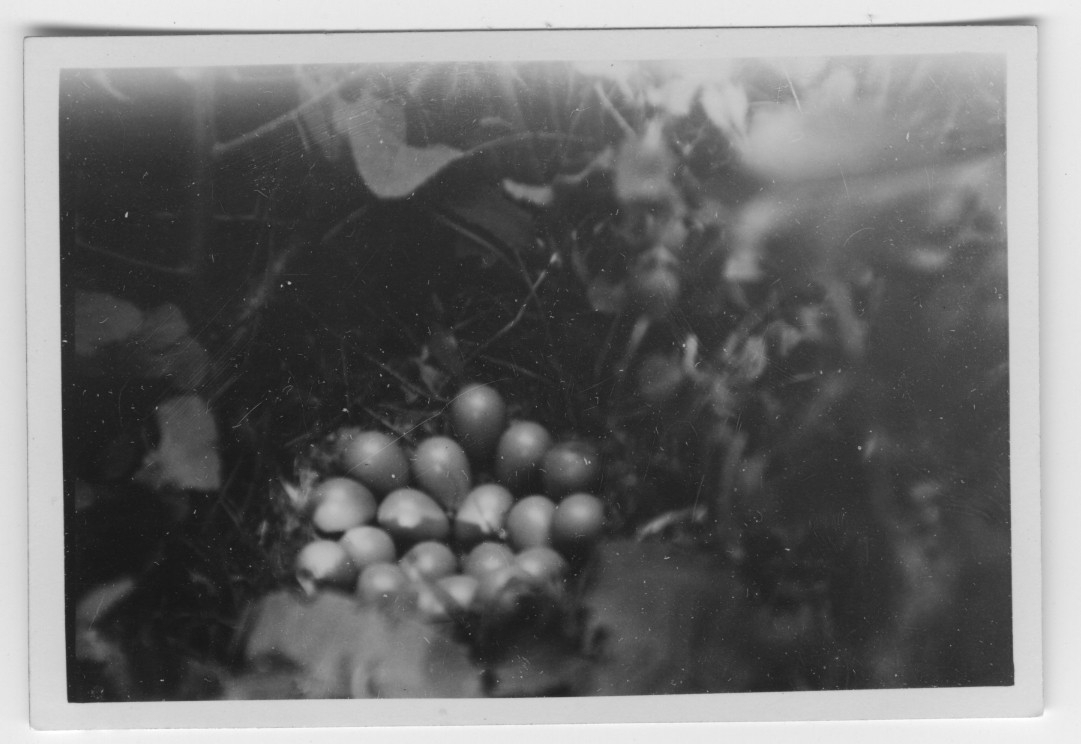 'Text enligt foto: ''Bo med 2 st nyvärpta ägg av rapphöna i ett buskage vid en åker invid Lenstads mosse. Fotot är taget på 55 cm avstånd.'' :: :: Ingår i serie med fotonr. 4500:1-172.'