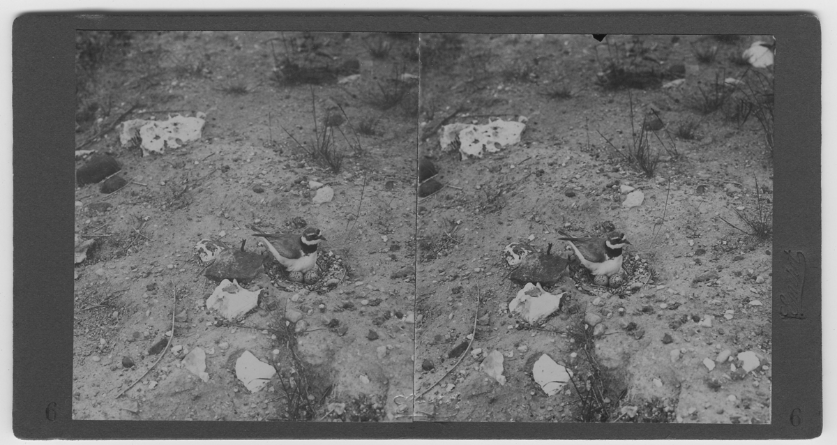 'Större strandpipare på ägg. :: :: Ingår i serie med fotonr. 423-434. Stereoskopbilderna är numrerade 1-12 och till dem hör ett kort där det står: stereoskopbilder av danska djur och fåglar i naturen tillhörande djurläkare Roar-Christensen. Nr 1-4 mindre strandpipare, nr. 5-8 större strandpipare, nr. 9-12 svartbent strandpipare.'