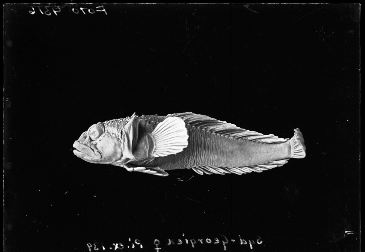 Titel: 'Harpagifer georgianus, sedd från sidan. Fynddatum: 1908-00-00. :: :: Ingår i serie med fotonr. 4316:1-4.'