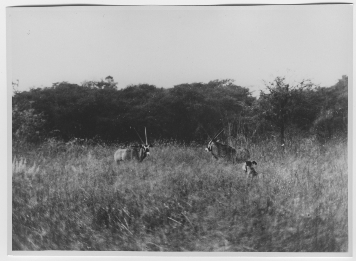 '2 st sabelantiloper i högt gräs med buskage i bakgrunden. :: :: Ingår i serie med fotonr. 4337-4348.'