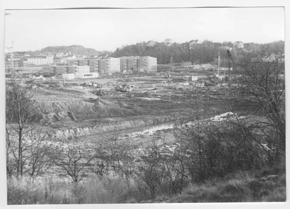 'Bildtext: ''Exploatering av sedimentyta. Riktning 153.'' :: Vy över exploateringsområdet med grävmaskiner. På avstånd syns flervåningshus, bostäder. :: :: Ingår i serie med fotonr. 6970:1-1125, dokumentation av Hisingens naturgeografi, visande landskapsformerna i stora drag och gjord inför exploateringen av området. Platserna för fotograferingen finns utsatta på karta i skala 1:4000 som finns på Göteborgs Naturhistoriska musem. Fotoriktningen mättes med kompass i gammalgrader.'