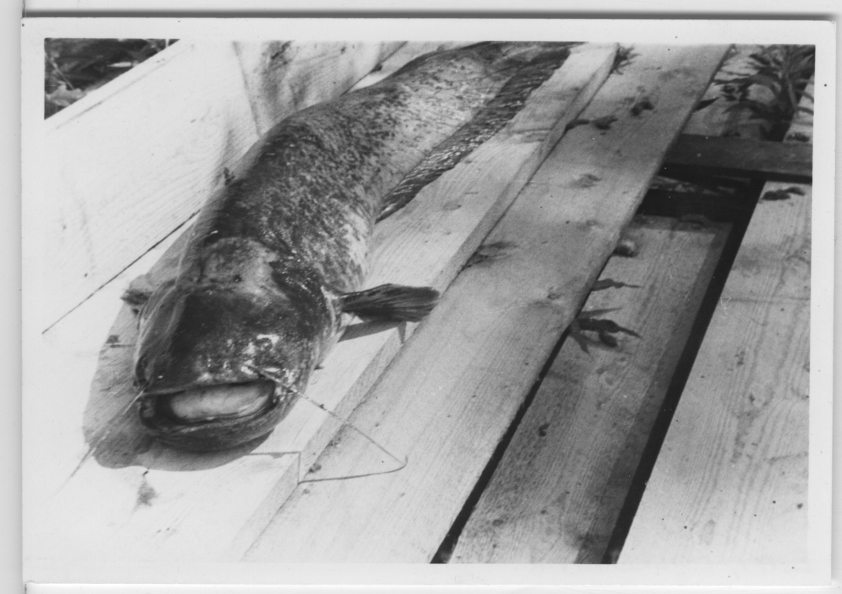 'Mal som ligger på träplankor. Fisken sedd framifrån. :: :: Ingår i serie med fotonr. 4550:1-4.'