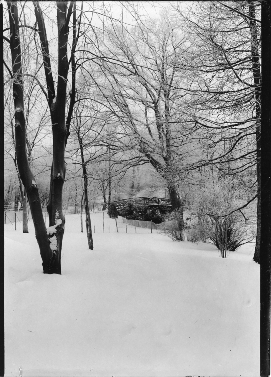 'Vy över snöklätt landskap med träbro över vattendrag. Vinterbild. :: :: Fotonr 5031-5033 :: (några som refuserats finns hos mig, enl. lös lapp)'