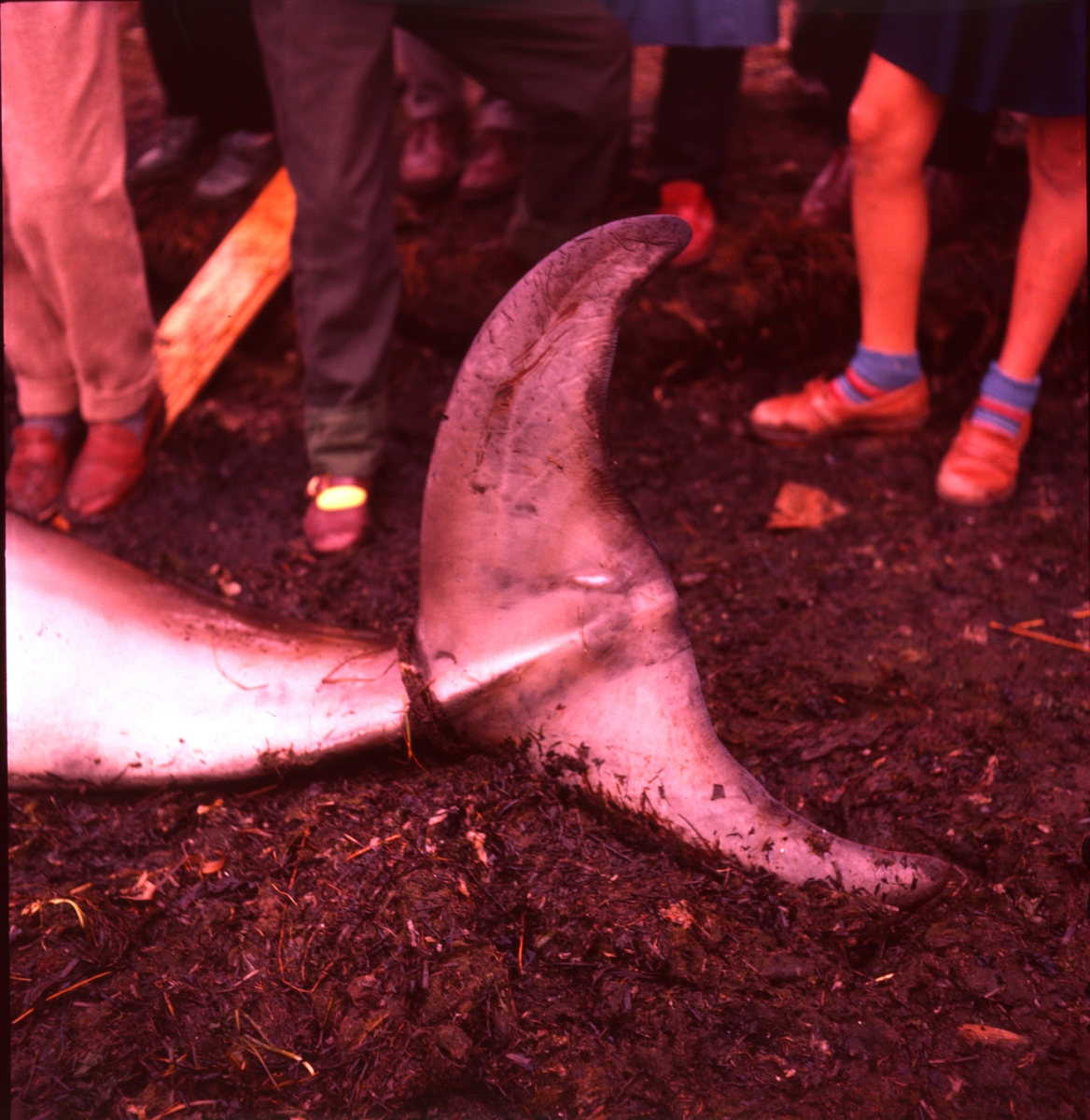 '2 näbbvalar, en gammal hona och en unge hittade, avgjutning gjord av ungen: :: :: Näbbval liggande i strandkant, stjärtdelen synlig. Grupp människor stående intill, bara benen synliga. :: :: Ingår i serie med Fotonr. 4673:1-12.'