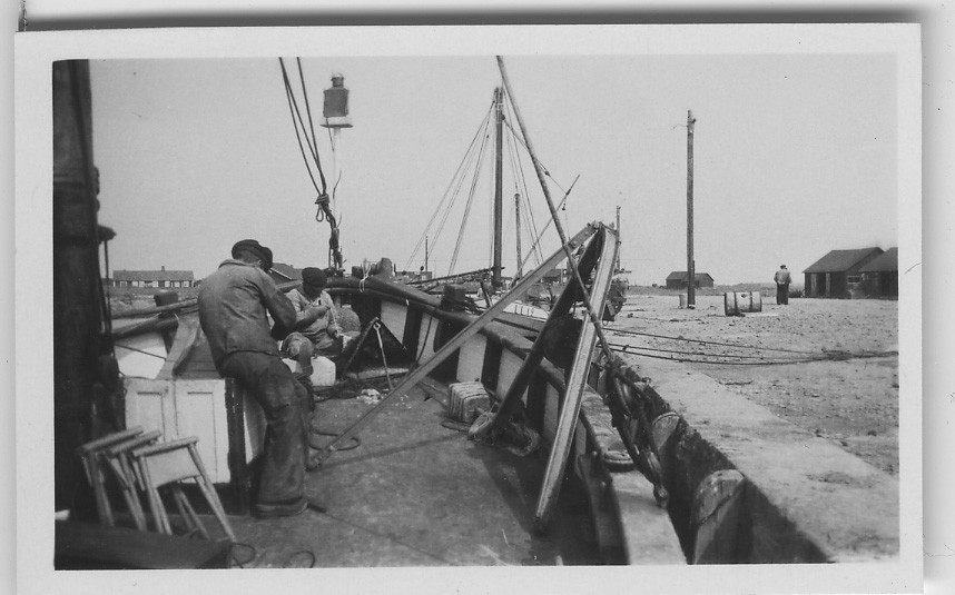 'Akkaexpedition, Bilder från Läsö och från båten (Skandia, FC51, FG51). :: :: Båt i hamn med byggnader och människa synliga i land på avstånd, samt 2 män i arbete på däck i förgrunden. Ihopfällbara stolar, pallar på båtdäck. :: :: Ingår i serie 5089:1-63. Se även fotonr 2401-2453.'