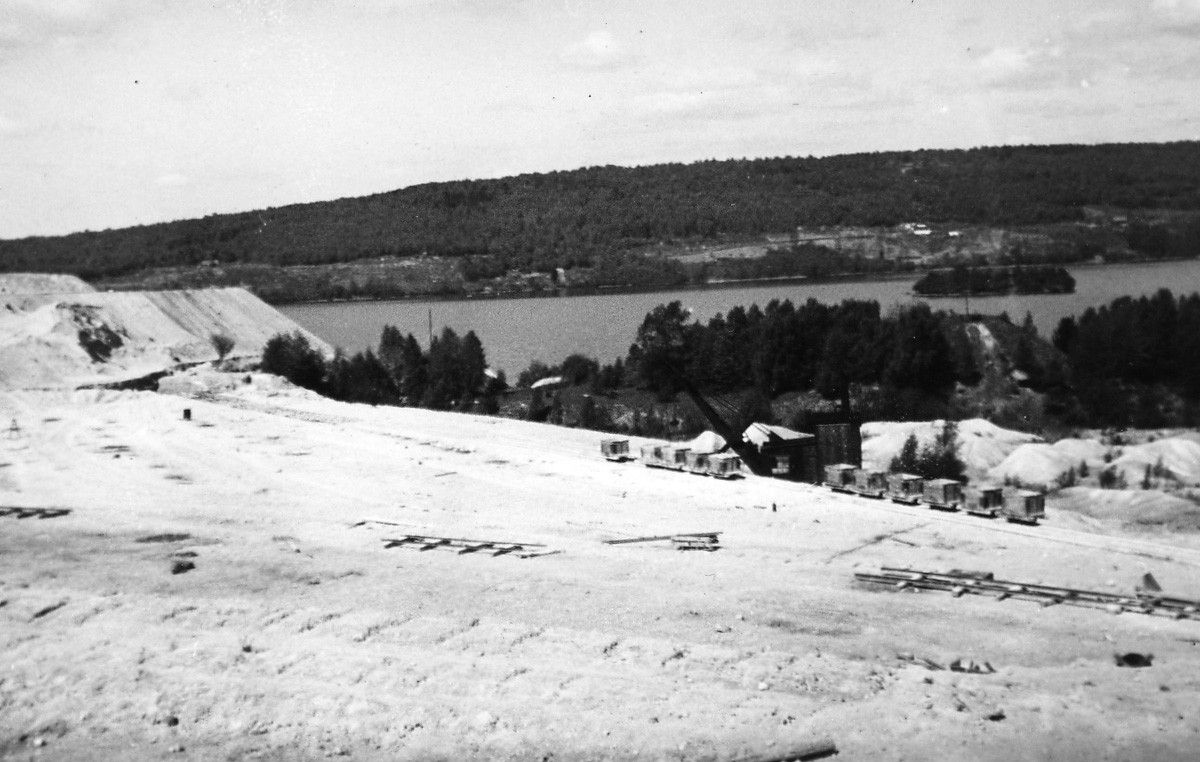 'Vy över Ivö kalkbrott, med rälsgående vagnar synliga, samt Ivösjön och och skog på fastlandet i bakgrunden. :: :: Ingår i serie med fotonr. 5088:1-7.'