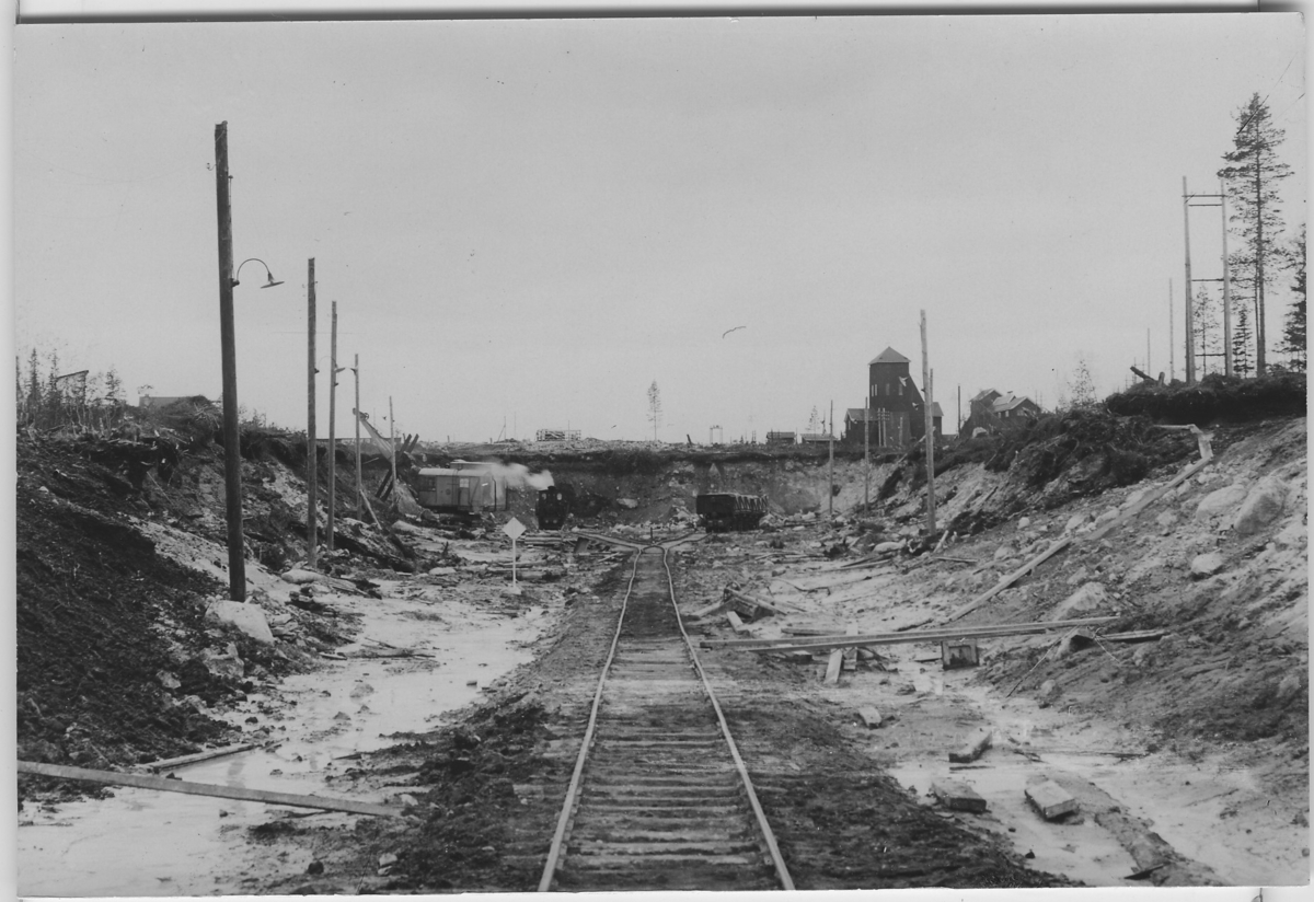 'Bolidens gruva, :: Bild på den s.k. Amerikanska utgrävningen, räls, vagnar och laven i bakgrunden. :: Samma motiv som 4960. :: :: Serie fotonr 4931-4967.'