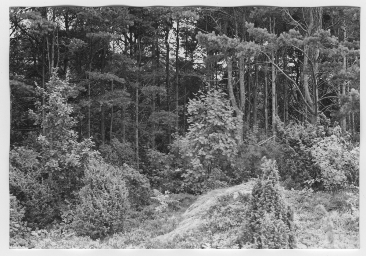 'Bildtext: ''Tallvegetation i spricka. Riktning 164.'' Närbild på tallträdsbestånd med en i förgrunden. :: :: Ingår i serie med fotonr. 6970:1-1125, dokumentation av Hisingens naturgeografi, visande landskapsformerna i stora drag och gjord inför exploateringen av området. Platserna för fotograferingen finns utsatta på karta i skala 1:4000 som finns på Göteborgs Naturhistoriska musem. Fotoriktningen mättes med kompass i gammalgrader.'