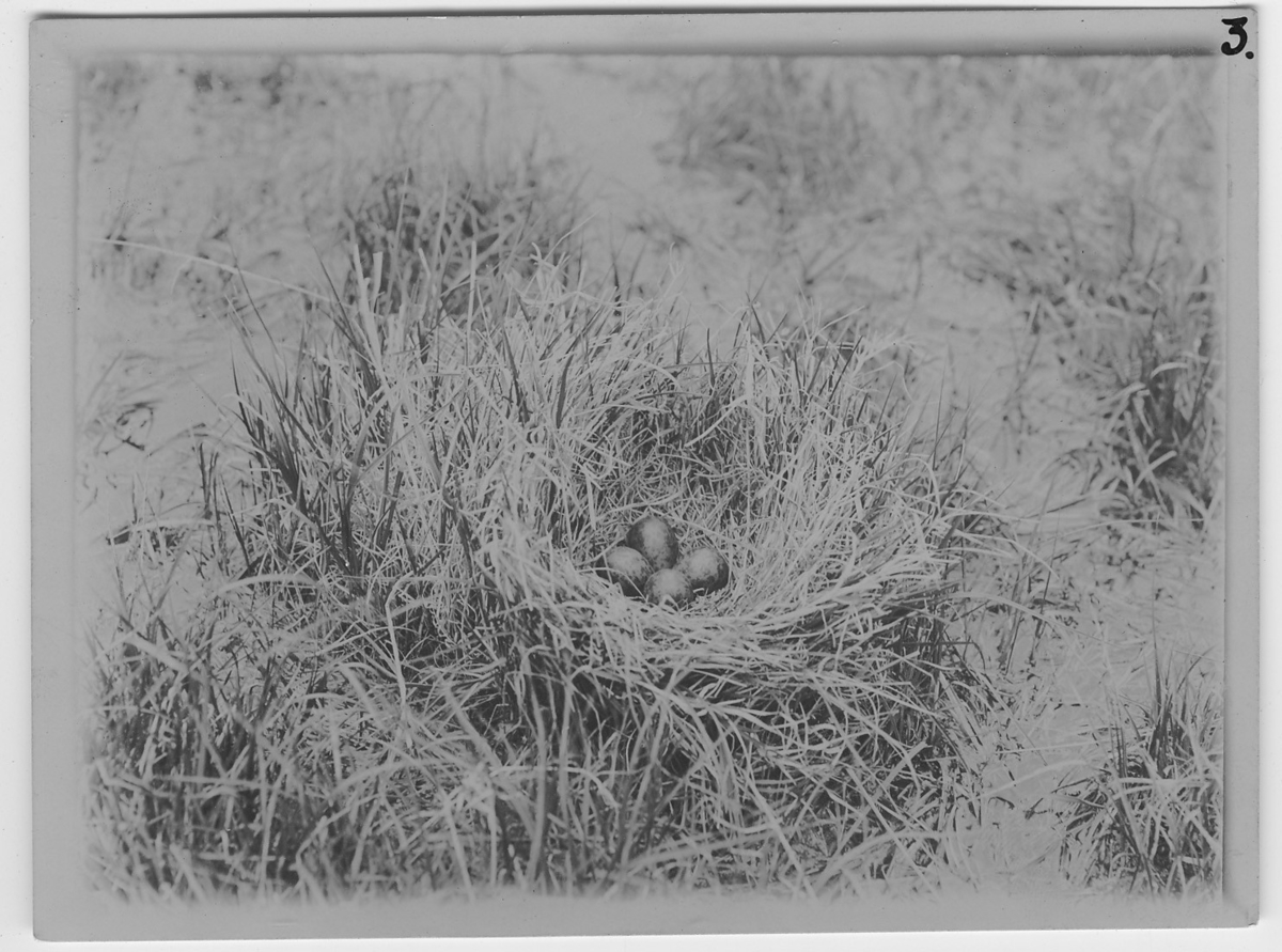 'Brushane, närbild på bo med 4 ägg vid stranden, i högt gräs. :: :: Ingår i serie med fotonr. 450-467.'