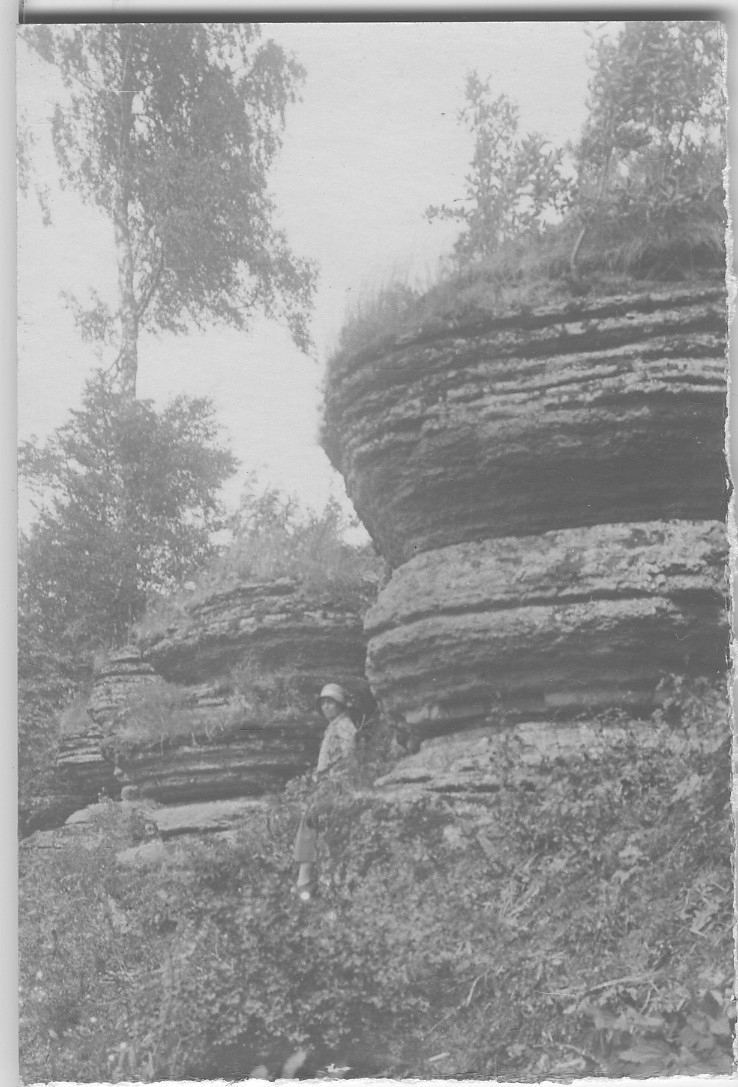 'Diverse foton från sannolikt Kinnekulle. Kalkbrott och naturliga skärningar. :: Vittrad klippa, 1 kvinna stående invid. Samma bild som 4885-4887, 4891. :: :: Serie fotonr 4885-4901.'