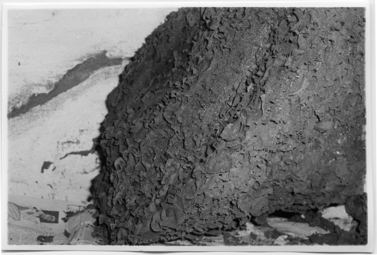 'Jättelikt bo av blanksvart trädmyra. Närbild på boet. Boet är ett pergamentsbo med storleken, 55 cm högt, bredd 55 cm, längd i horisontalplan 63 cm och vikt 6 kg. :: :: Ingår i serie med fotonr. 5086:1-9, se även fotonr. 4716-4729.'