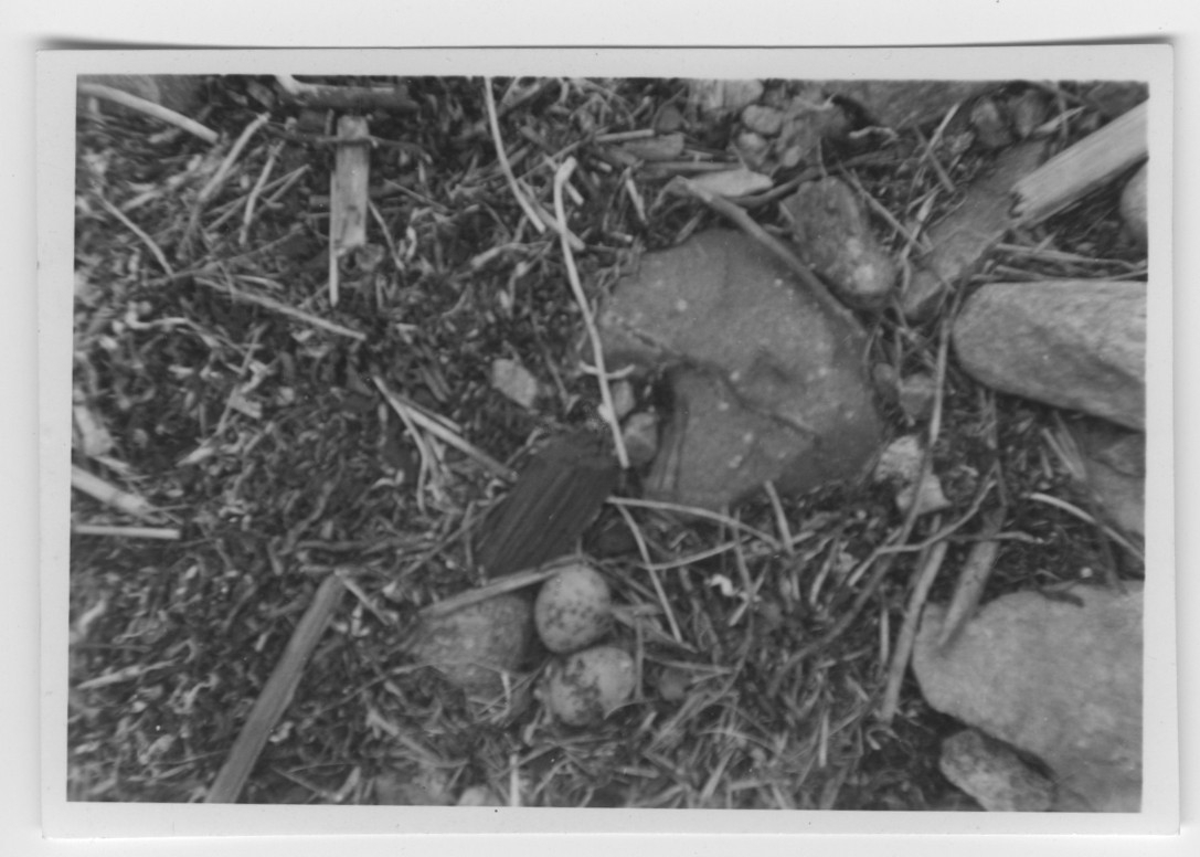 '2 st ägg av fisktärna, invid stenblock. :: :: Text på baksidan av fotografiet: ''Omstående fotografi är taget på fisktärnans ägg, som låg så gott som utan rede vid en sten på en strand mellan de höga bergen på Stenholmen. Ungefär 10 meter från detta bo hade en annan tärna värpt sina 3 st ägg lika primitivt.'' :: :: Ingår i serie med fotonr. 4540:1-24.'