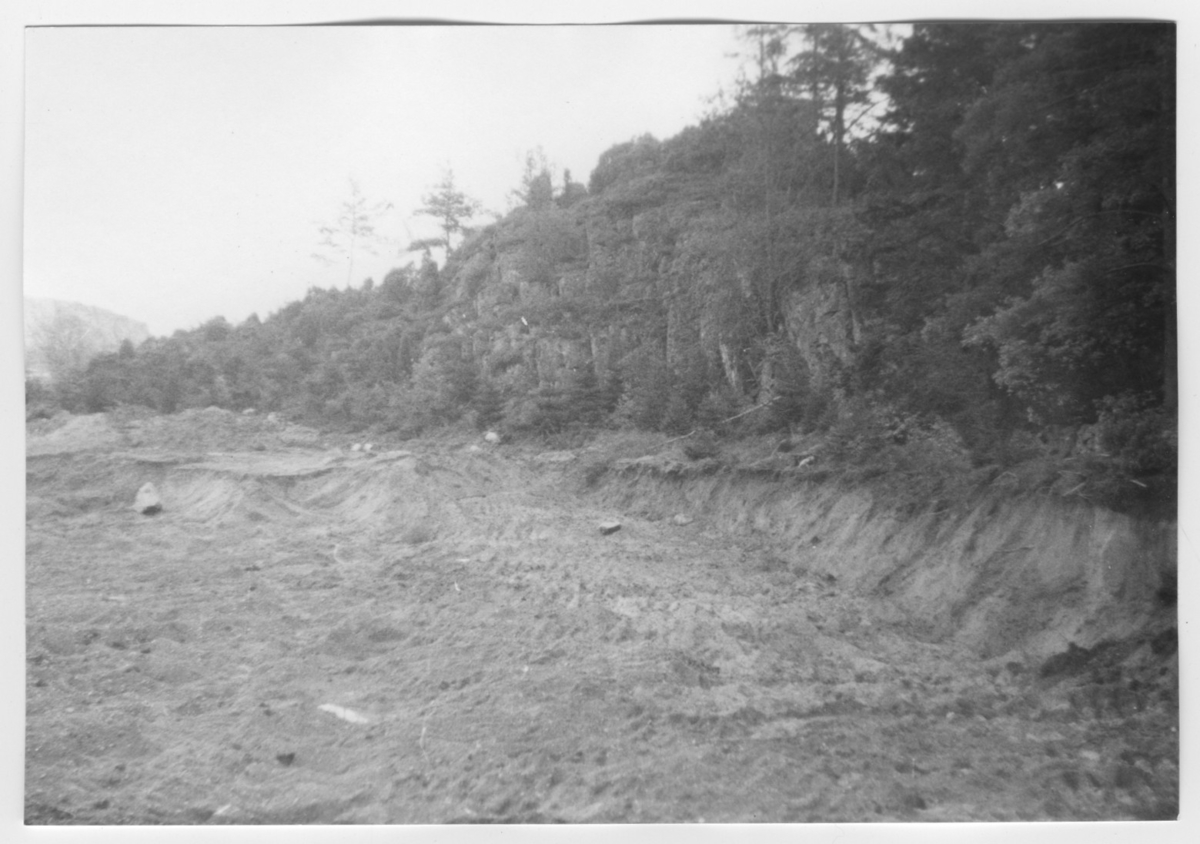 'Bildtext: ''Sand. Bergvägg. Riktning 82.'' :: :: Ingår i serie med fotonr. 6970:1-1125, dokumentation av Hisingens naturgeografi, visande landskapsformerna i stora drag och gjord inför exploateringen av området. Platserna för fotograferingen finns utsatta på karta i skala 1:4000 som finns på Göteborgs Naturhistoriska musem. Fotoriktningen mättes med kompass i gammalgrader.'