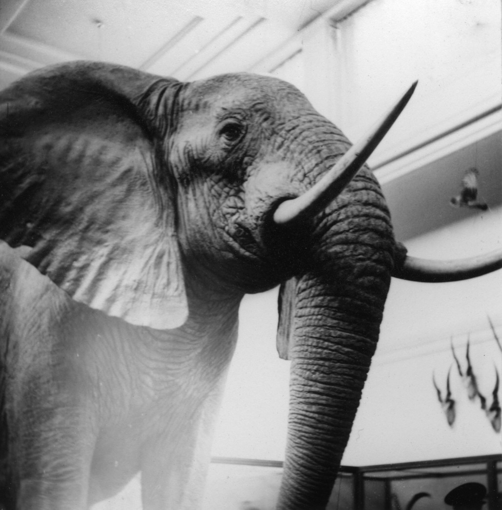 'Den monterade elefanten i däggdjurssalen. :: :: Närbild på huvudet fotograferat underifrån/från sidan.'