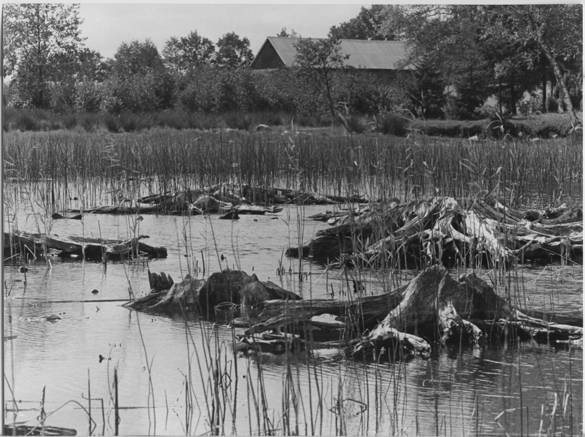 'Subfossila tallstubbar i vik i höjd med klev vid mitten av Östra Öresjöns sydöstra strand. I bakgrunden syns en lada/gårdsbyggnad. :: :: Fotonr 4709 - 4714'