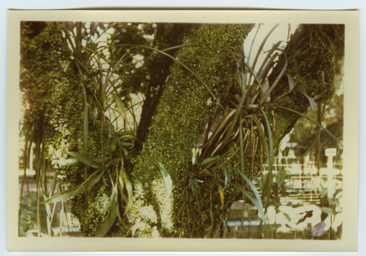 'Färgkopior efter diabilder tagna av Bengt Hubendick 1966 i Amazonas, ett par mil norr om Manaus i Beléms botaniska trädgård och på Trinidad: :: :: Närbild på träd, byggnad i foden. :: :: Ingår i serie med fotonr. 4730-4768.'