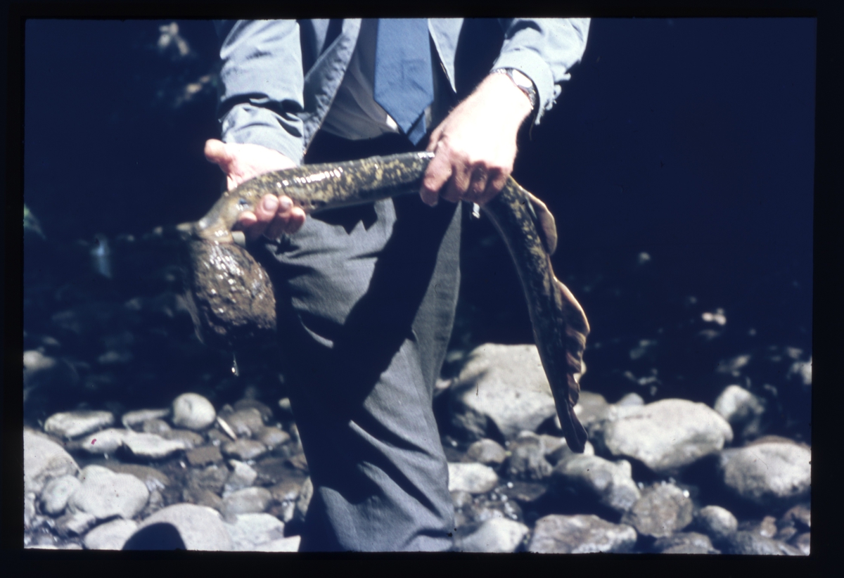 '1 person bär 1 havsnejonöga. :: :: Ingår i serie med fotonr. 4653-4657, 4659-4672.'