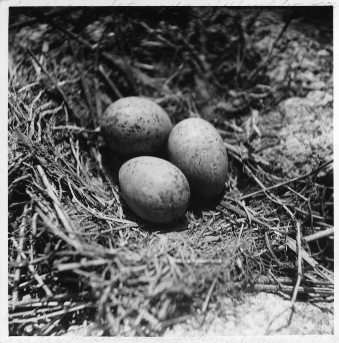 'Enligt anteckning på fotografiets baksida: :: ''Här ligger det enda silltrutbo, som jag såg bland alla fiskmåsbona. :: Det låg mycket långt ut i Hjälmaren.'' :: :: Ingår i en serie med fotonr. 4512:1-57 med diverse foton av fågelbon med ägg och ungar. Varje fotografi har utförliga anteckningar på sin baksida, kopierade från framsidan, spår av de på framsidan är fortfarande synliga.'