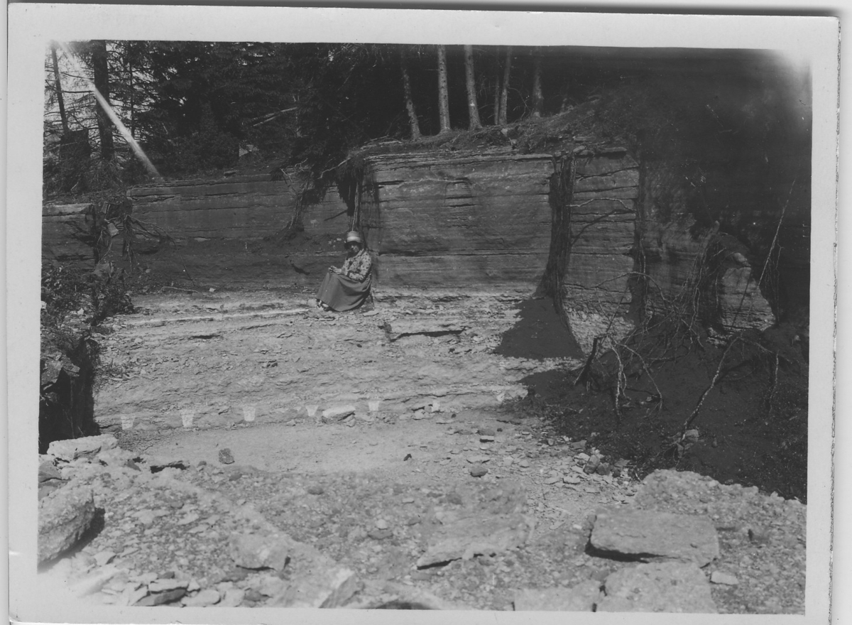 'Diverse foton från sannolikt Kinnekulle. Kalkbrott och naturliga skärningar. :: Bild på en ca 2 m. hög brottvägg, kvinna sitter lutad mot väggen. Dagbrott. Samma bild som 4888,4889, 4893. :: :: Serie fotonr 4885-4901.'