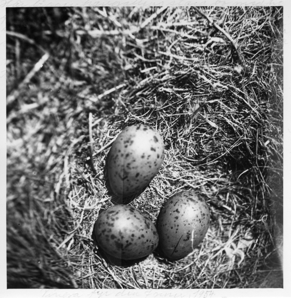 'Enligt anteckning på fotografiets baksida: :: ''Här ligger havgallens [havstrut] stora bo med tre fullruvade ägg i en bergsklyfta på östra sidan av östra halvön av Vinga. Detta är den västligaste häckningen av denna fågel. Bilden togs på 50 cm avstånd. Kolonien innehöll ett tiotal par.'' :: :: Ingår i en serie med fotonr. 4512:1-57 med diverse foton av fågelbon med ägg och ungar. Varje fotografi har utförliga anteckningar på sin baksida, kopierade från framsidan, spår av de på framsidan är fortfarande synliga.'