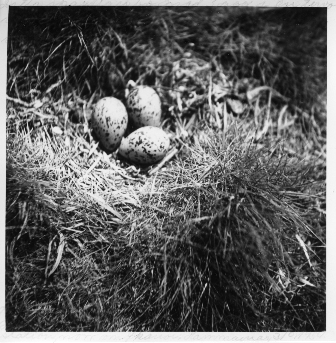 'Enligt anteckning på fotografiets baksida: :: ''Det skärfläcksbo med tre ägg i en tuva var det första jag fann i den stora kolonien på ett 20-tal par. :: Kolonien låg på det fridlysta Hammarnäs 3 km väster om Foteviks station, norr om Skanör.'' :: :: Ingår i en serie med fotonr. 4512:1-57 med diverse foton av fågelbon med ägg och ungar. Varje fotografi har utförliga anteckningar på sin baksida, kopierade från framsidan, spår av de på framsidan är fortfarande synliga.'
