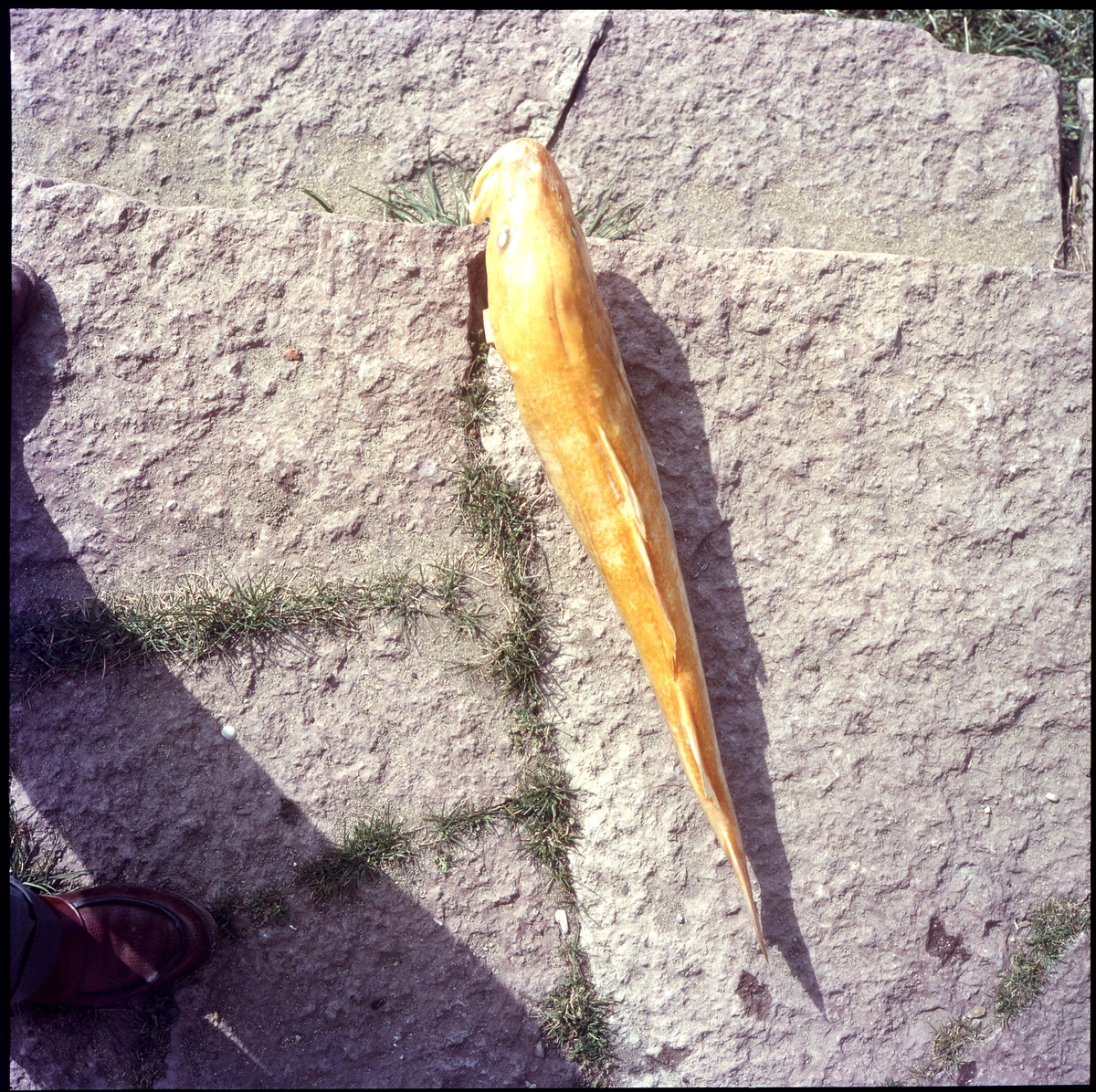 'Torsk, brandgul färgvaritet, liggande på stenplattor, sedd rakt ovanifrån. Fynddatum 1957-04-11. :: :: Ingår i serie med fotonr. 4676:1-6, se även fotonr. 4677:1-3.'