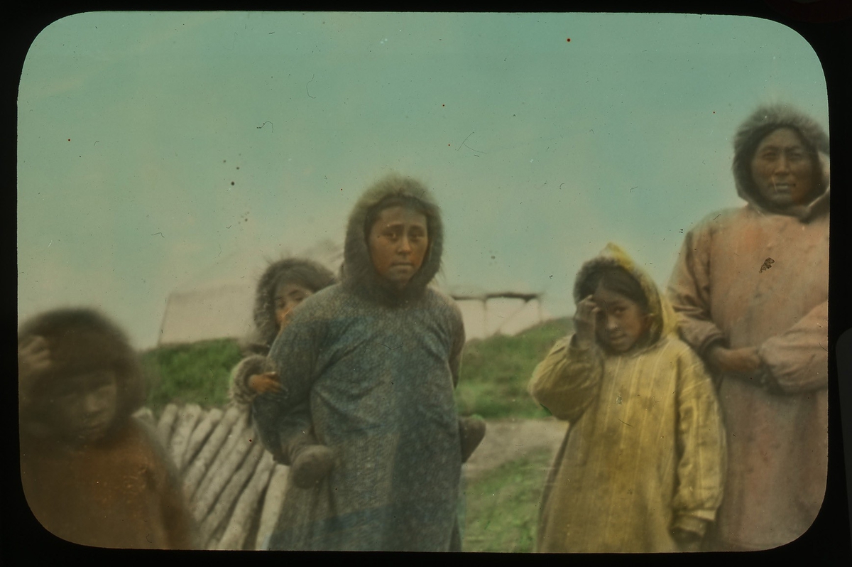 '5 st kvinnor och barn, inuiter (eskimåer). Text på på glaset: ''Eskimo women and children, Mackenzie Delta.'' Kläder. Klädsel. :: :: Ingår i serie med fotonr. 5203:1-22. Se även hela fotonr. 5202-5218 med bilder från Frits Johansen.'