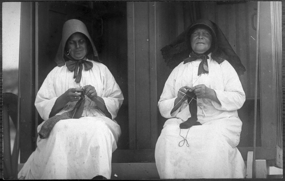 '2 kvinnor sitter utanför byggnad iklädda hycklen, hättor med rosett knuten under hakan. Kvinnorna håller i stickarbeten. Strumpstickor. :: :: :: Ingår i serie med fotonr. 5139:1-36. Fotonr. 5139:1-17 ligger i en ask med texten ''med motiv från (enligt pappasken) Helgoland. För diapositiv.'' Fotonr. 5139:18-27 ligger i en pappask med texten: ''Helgoland (''Augusta'')'' en del för diapositiv. Fotonr. 5139:28-36 ligger i en ask med texten ''Dubbletter från Helgoland. Dessutom diapositiv från Kristineberg och Lysekil.'''