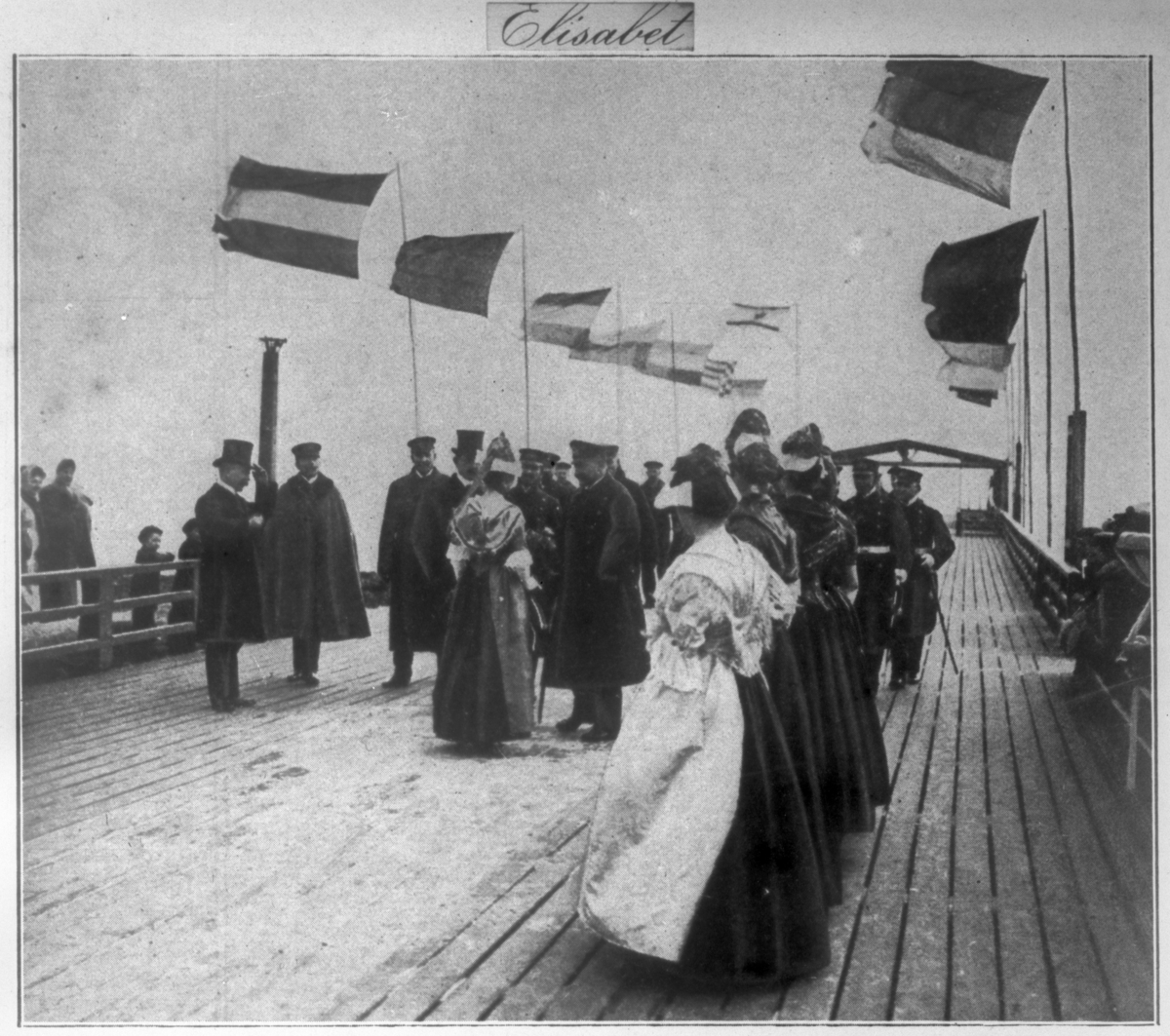 'Folksamling på form av brygga. Människorna iklädda uniformer, hatt, uppklädda. Står ''Elisabet'' över bilden. Troligen tryck. Längs bryggan olika flaggor. :: :: :: Ingår i serie med fotonr. 5139:1-36. Fotonr. 5139:1-17 ligger i en ask med texten ''med motiv från (enligt pappasken) Helgoland. För diapositiv.'' Fotonr. 5139:18-27 ligger i en pappask med texten: ''Helgoland (''Augusta'')'' en del för diapositiv. Fotonr. 5139:28-36 ligger i en ask med texten ''Dubbletter från Helgoland. Dessutom diapositiv från Kristineberg och Lysekil.'''
