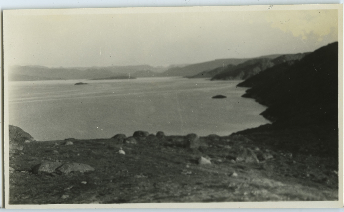 'Vy över bukten från östsidan av Proeven. Snöklädda berg i bakgrunden (enligt dagboken). :: :: Enligt kuvertet som negativet låg i ''Trip to W-Greenland XIV''. :: :: Ingår i serie Fotonr. 5217:1-103. Se även hela fotonr. 5202-5218 med bilder från Frits Johansen.'