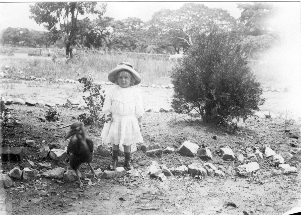 'Diverse fotografier från bl.a. dåvarande Nordrhodesia, nu Zambia, tagna av Konsul Magnus Leijer. :: :: En flicka stående vid en grusväg. Snett framifrån rör sig en fågel på marken. I bakgrunden, gräs, buskar och träd.'