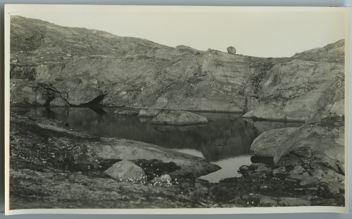 'Vattenhål omgärdat av berg, vid Kateket-Naesset. :: :: Enligt kuvertet som negativet låg i ''Trip to W-Greenland VII''. :: :: :: Ingår i serie Fotonr. 5217:1-103. Se även hela fotonr. 5202-5218 med bilder från Frits Johansen.'