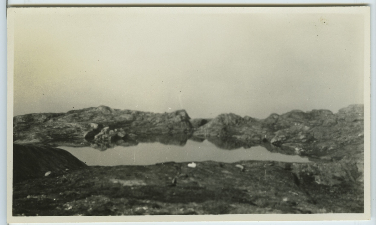 'Vy över ''Typhus''sjö som ligger mellan hamnen och Upernivik by. Sjön är ett djupt hål och används av lokalbefolkningen för färskvatten. :: Enligt kuvertet som negativet låg i ''Trip to W-Greenland VI''. :: :: Ingår i serie Fotonr. 5217:1-103. Se även hela fotonr. 5202-5218 med bilder från Frits Johansen.'