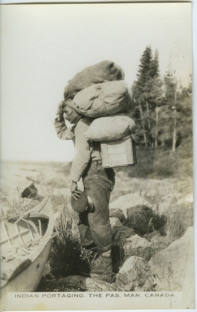 '''Indian portaging. The Pas. Man, Canada'' 1 st man bärande packning, på ryggen, bestående av en trälåda och tre säckliknande föremål. Intill syns en kanot. :: :: Ingår i serie Fotonr. 5218:1-12. Se även hela fotonr. 5202-5218 med bilder från Frits Johansen.'