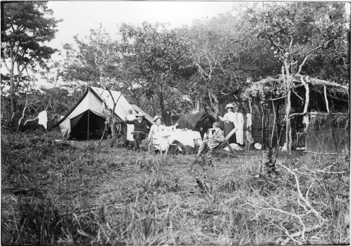 'Diverse fotografier från bl.a. dåvarande Nordrhodesia, nu Zambia, tagna av Konsul Magnus Leijer. :: :: 2 st män och 1 st kvinna sittandes vid ett dukat bord i gräset framför ett tält. Bakom står 4 st män och 1 st kvinna vid 2 hästar. :: :: Samma motiv fotonr. 1487.'